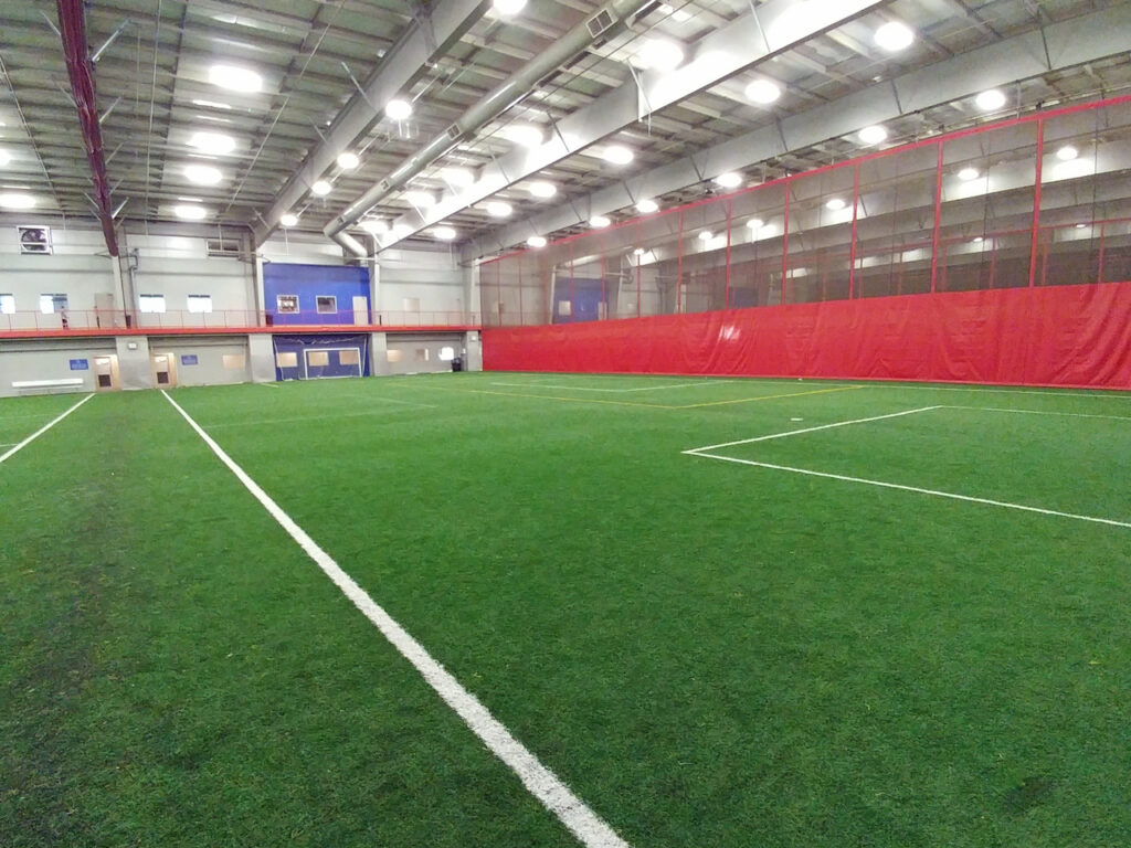 The indoor turf field is 78′ x 145′ with a high ceiling and good lighting.